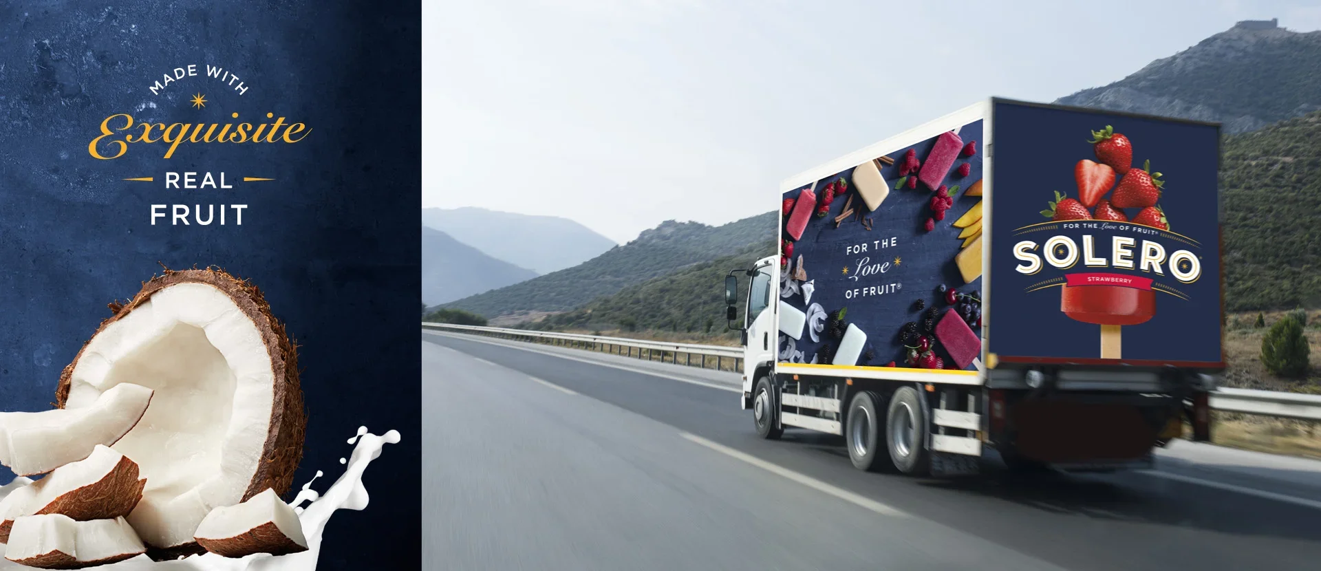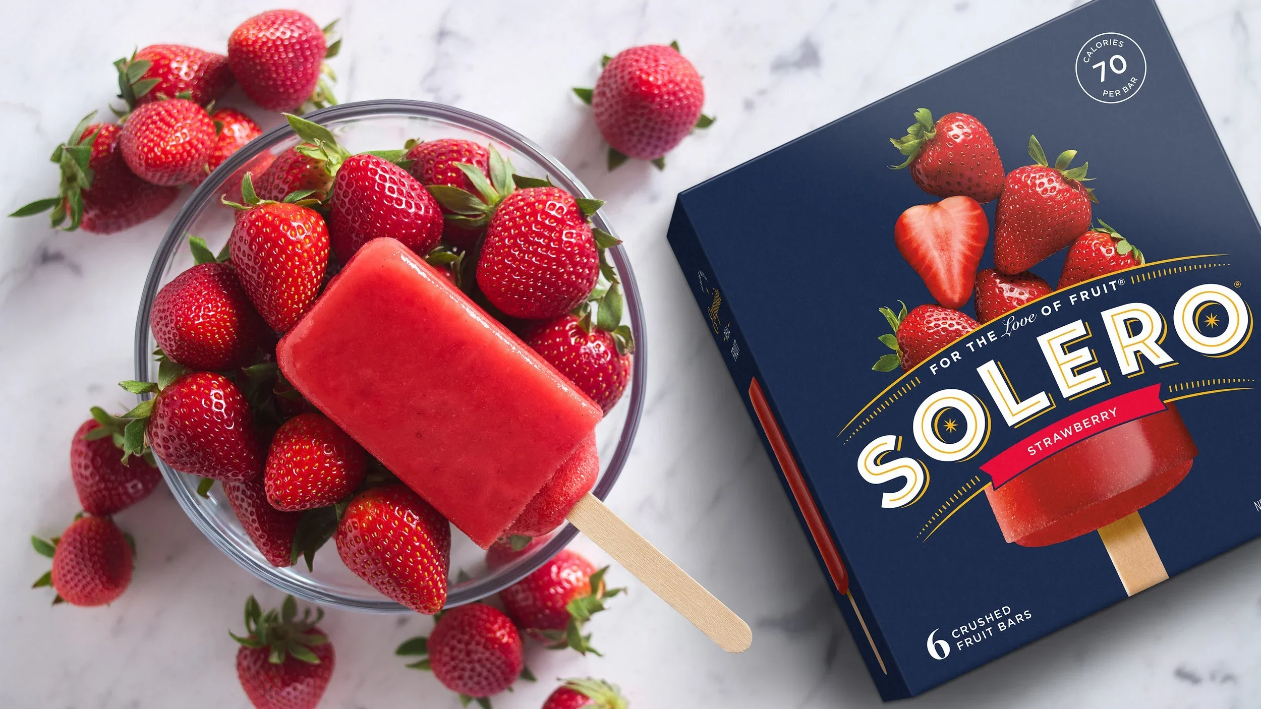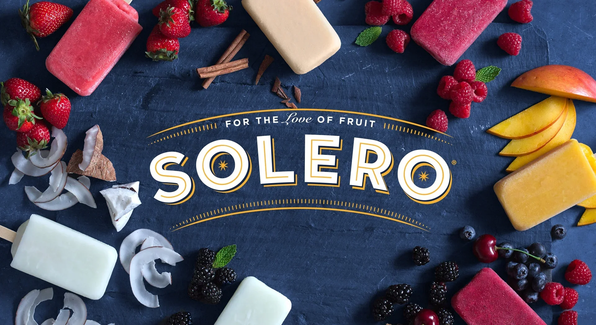 We created a premium package leaning into the beauty of real, perfect fruit for maximum taste appeal. Noting the absence of rich dark color in the set, we felt this brand could really own the color navy to help the natural fruit colors outshine its competition. We also renamed the product “Solero” as we felt it would be better suited for the positioning.